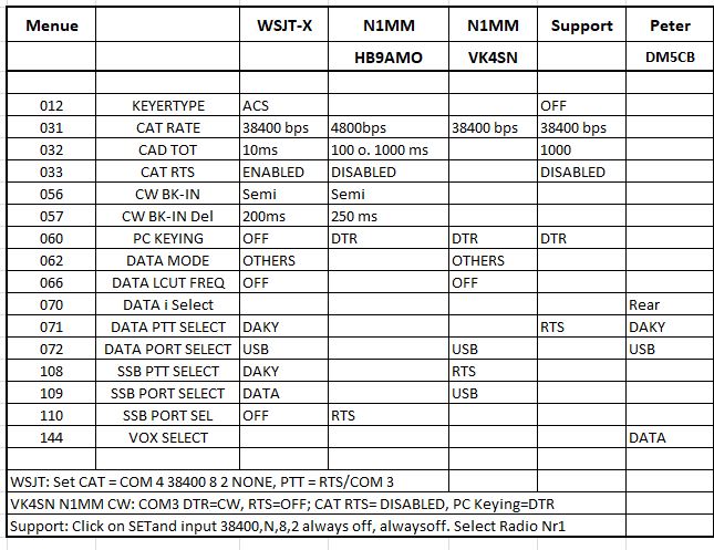 Nebenstehend eine Tabelle mit den Einstellungen für den FT 991 A, die ich im Internet gefunden habe, als ich N1MM+ zum laufen bringen wollte. Die wohl einzige wichtige Einstellung ist die "Speed", - 031 - siehe oben. |