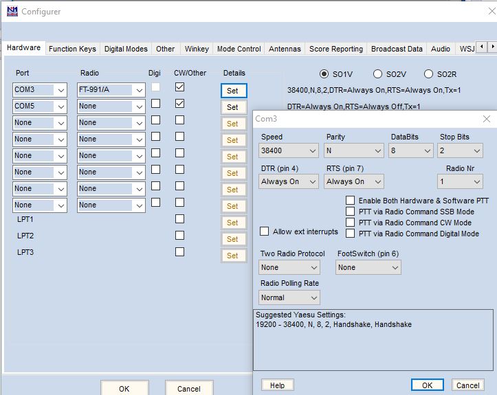 | An beiden Stationen verwende ich den WinKey. Der IC 7600 verfügt auf der Rückseite einen weiten Key-Anschluss. Der FT 991 A verfügt nur über einen Anschluss vorn. Man kann den KEYer aber am WinKey anschließen. Beide Stationen sind per USB mit den Rechnern verbunden. Hierzu muss man den Treiber für die COM-Schnittstellen installieren. Hier die "Settings" für den IC 7600 und den FT 991 A. Unter "Hardware" (Tabellen 2 und 3) sind die COM-Schnittstellen einzustellen. Wichtig ist, dass die "Speed" mit der Einstellung im Transceiver übereinstimmt.