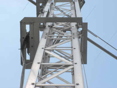 | Der große Vorteil des Hummel-Towers ist, daß jede Reparatur oder Änderung an den Antennen ohne fremde Hilfe ausgeführt werden kann. Bei herunter gefahrenem Schlitten und nach Lösen von vier Schrauben am Oberlager läßt sich das Standrohr, ein 4m langes VA-Rohr, kippen. Alle Teile der Antenne sind gut zugänglich. | ![]() |